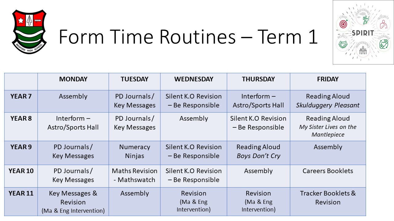 At Bedford all students have a form tutor and a year team that supports them through the year. We have a termly form time routine for each year group which supports the curriculum (literacy, numeracy and reading) as well as personal development and interform activities.